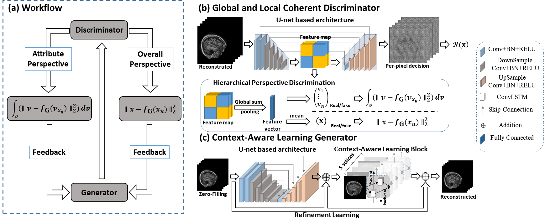 图1. (a) 本方法流程图,(b) 全局局部相干判别模块,(c) 上下文感知学习生成模块
