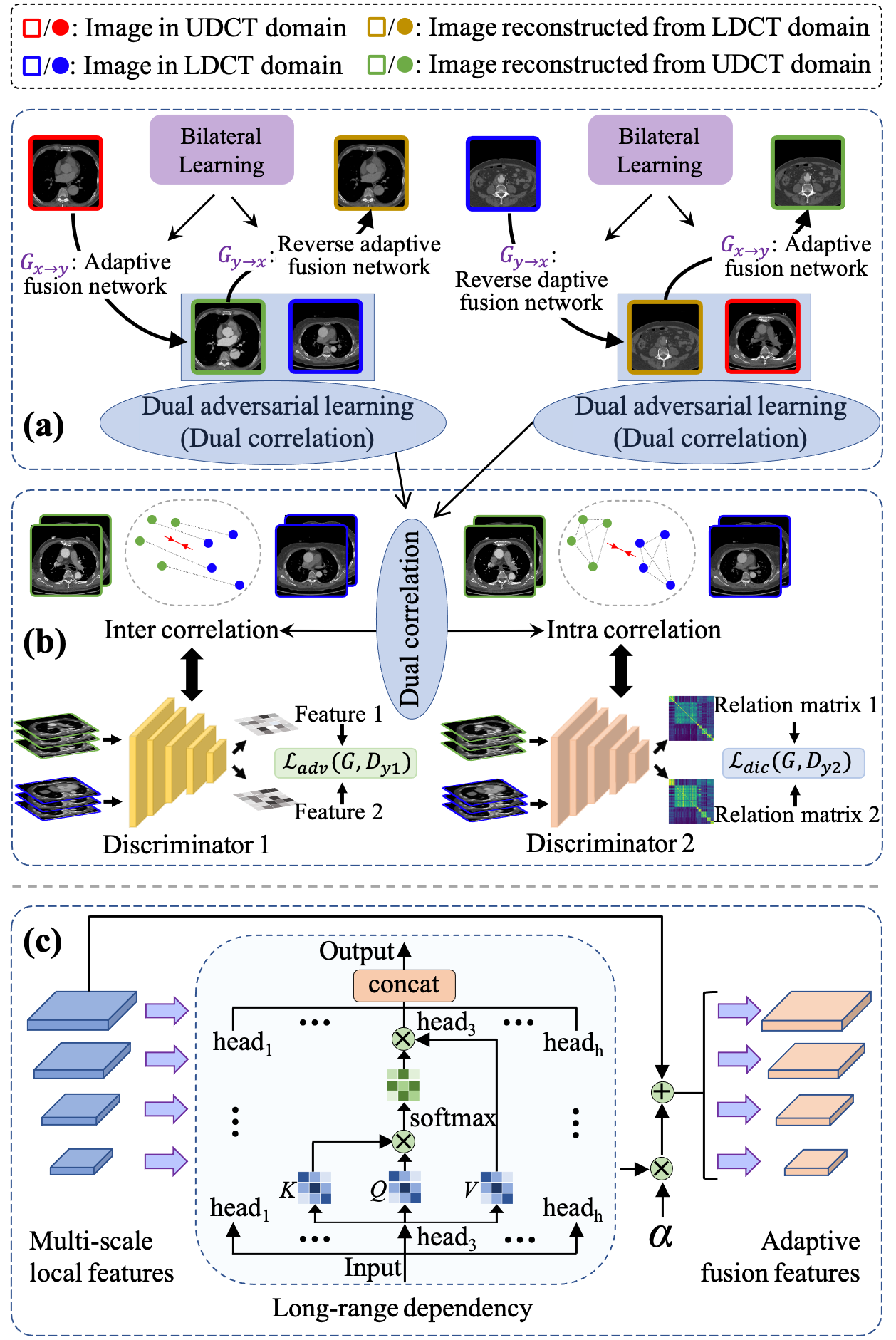 我院健康信息智能计算团队联合首都医科大学附属北京安贞医院徐磊主任医师和英国帝国理工学院杨光教授,提出了一种基于多重对抗学习的血管造影重建方法,从低剂量对比剂下的CT造影图像中重建高剂量对比剂下的CT造影图像。该方法设计了一种双边机制来学习源域(低剂量图像)和目标域(高剂量图像)之间的映射关系,并引入双重相关性约束模块以同时对跨域特征的分布均匀性和域内样本的不一致性进行建模,最后对多尺度信息和长距离交互依赖进行自适应融合,以降低高噪声金属植入物的对图像重建的干扰。方法的模型结构如图3所示。