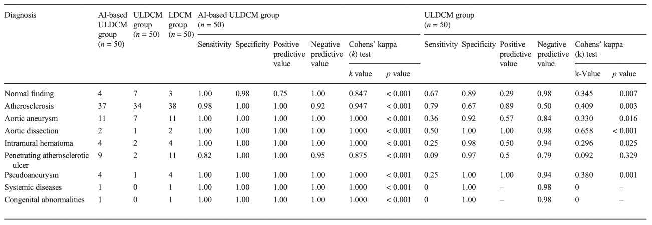 进一步将本方法应用于临床实验中。结果显示本方法重建出的高剂量CT图像与临床低剂量CT图像所获得的主动脉疾病诊断结果接近,如下表所示: