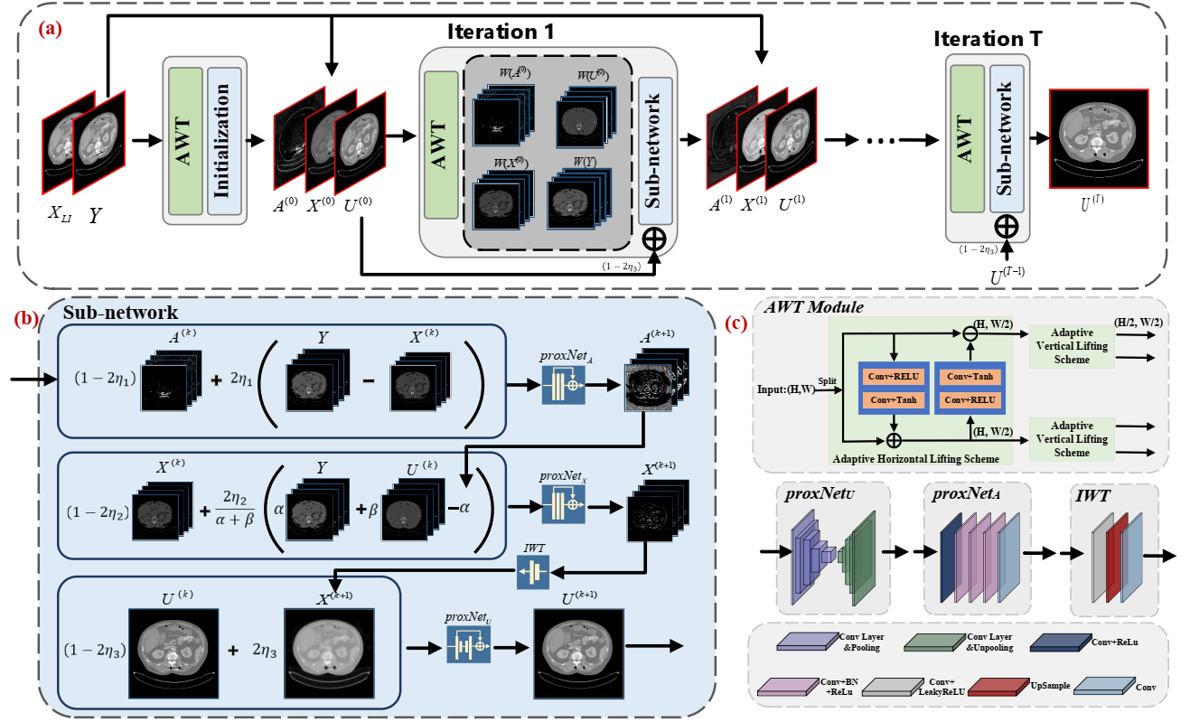 我院健康信息智能计算团队提出了一种基于小波变换的多层次迭代自适应金属伪影去除方法,从受金属伪影影响严重的低质量CT图片中恢复出高质量图片。研究发现,金属伪影在不同频段表现出不同的特征,并主要集中于高频。基于此发现,该方法利用小波变换挖掘金属伪影在不同频率分量上的深层次特征,并提出了迭代优化算法,最后根据优化算法构建了自适应迭代网络,以增强深度学习网络的可解释性,有效去除图像中的金属伪影。方法的模型结构如图4所示。