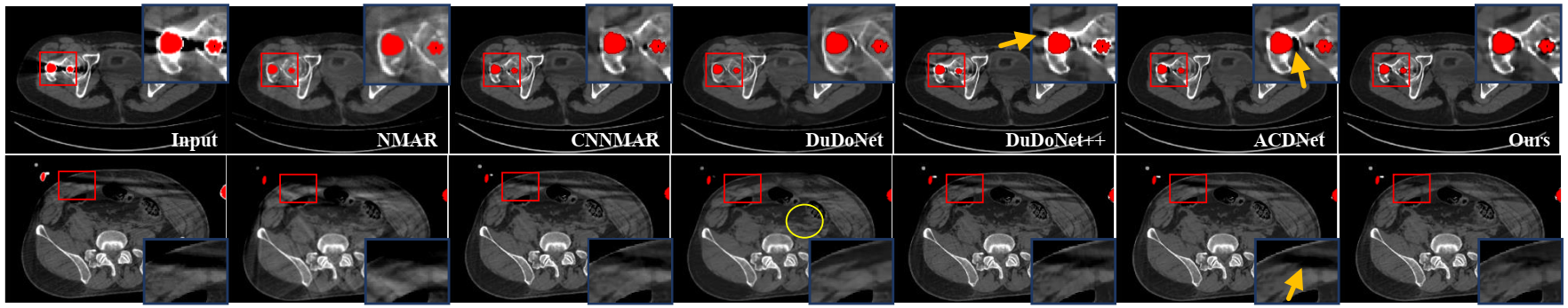 图5:与几种金属伪影去除方法的临床数据集对比结果。