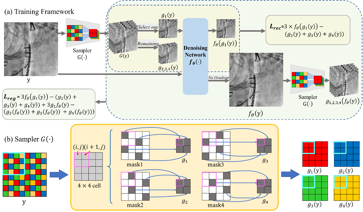 我院健康信息智能计算团队联合上海一影医疗科技有限公司,提出了一种基于全图像指数剩余的自监督技术(FIRE),用于单次低剂量DR/CT去噪。具体来说,提出的FIRE方法首先利用图像索引余数技术将整个高维图像空间划分为一系列低维子图像空间。在这里,基于完整图像索引的剩余部分,设计了一个特定的图像采样器来对图像进行采样。此外,提出了一种新的损失函数来训练无监督图像去噪网络。为了进一步优化可行域,方法还引入正则化策略,通过减小自监督去噪网络与监督去噪网络之间的差距来限制子空间图像的训练。本方法的模型结构如图6所示。