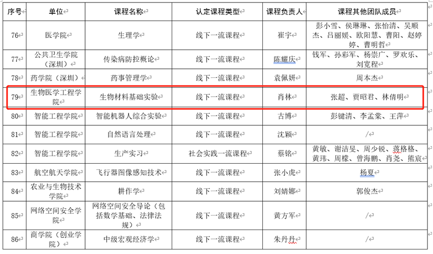 近日,我校公布了2024年校级一流本科课程认定结果,经教师(团队)自主申报、学院推荐、专家评审、学校教学指导委员会审议、公示等环节,由TOMID团队教师主讲的《生物材料基础实验》成功入围2024年中山大学一流本科课程,被认定为线下一流课程。课程团队成员包括张超教授、肖林副教授、贾昭君副教授、林倩明助理教授。