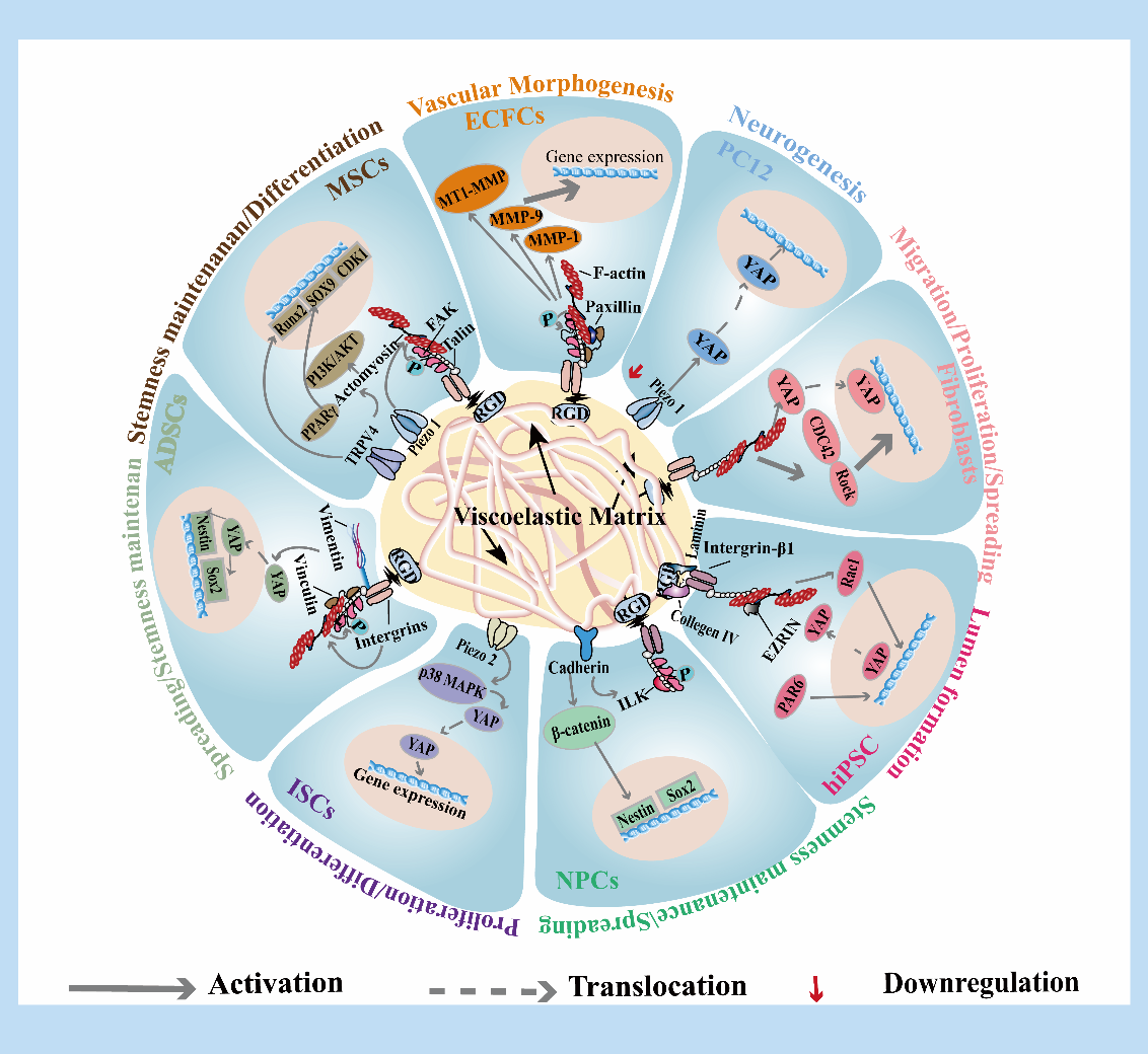 文章首先归纳了粘弹性水凝胶的制备策略,着重从改变交联密度、侧链长度密度引起的空间位阻以及交联的可逆性等维度,剖析了如何实现对水凝胶粘弹性的调控。随后,文章全面阐述了基质粘弹性对各类细胞的调控机制,重点介绍了在力转导过程中,细胞表面受体(如整合素、机械敏感型离子通道)以及细胞骨架等蛋白激活细胞内信号、调节细胞功能的过程。最后,文章总结了粘弹性水凝胶在骨组织、皮肤、脑组织及牙周韧带再生、类器官培育等应用领域的最新研究进展。此外,作者深入探讨了粘弹性水凝胶进一步发展亟需解决的核心问题,如解耦水凝胶网络的交联属性与动态 / 粘弹性行为之间的相关性、实现水凝胶网络的精确调控等。同时,文章指出,材料粘弹性对细胞的影响受细胞微环境、细胞类型、生长因子等因素的影响,并可能表现出组织特异性,这提示了本领域未来发展的潜在机遇。