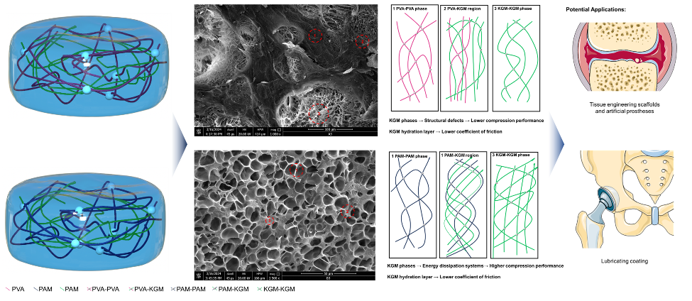 研究团队分别制备了PVA-KGM和PAM-KGM两种不同交联机制的复合水凝胶,通过SEM、FTIR和XRD等表征分析了复合水凝胶的微观结构,结合力学压缩测试和摩擦试验结果,探究并阐述了KGM对水凝胶结构与水凝胶力学性能和润滑性能之间的关联。结果表明,PVA-KGM复合水凝胶出现KGM的相分离网络并造成水凝胶结构缺陷,降低压缩模量和压缩强度,PAM-KGM复合水凝胶中KGM物理交联网络起到能量耗散作用提高水凝胶的压缩性能。同时,KGM都降低了PVA和PAM水凝胶的摩擦系数,且两组水凝胶都具有良好的生物相容性。