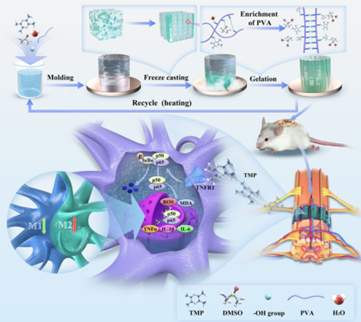 近日,TOMID团队宋剑课题组联合北京中医药大学东直门医院和德国亥姆赫兹慕尼黑中心,提出了一种具备定向结构微相分离聚乙烯醇(PVA)水凝胶、原位包载川芎嗪(TMP)实现继发损伤干预。该策略通过建立生物力学线索、微观拓扑线索、生物化学线索,协同构建脊髓损伤修复微环境。在材料制备过程中,本研究首次联用微观相分离原理与定向冷冻铸造技术,一方面使“PVA-二甲基亚砜-水”三元溶解系的相分离过程与水相的定向结晶相耦合,另一方面利用TMP与PVA之间存在的氢键连接、在凝胶化转变中实现PVA大分子网络对TMP的原位包载。
