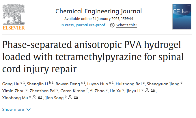 论文信息:Gang Liu, Shenglin Li, Bowen Deng, Luyao Huo, Huizhong Bai, Shengyuan Jiang, Yimin Zhou, Zhenzhen Pei, Ceren Kimna, Yi Zhao, Lin Xu, Jinyu Li, Xiaohong Mu, Jian Song, Phase-separated anisotropic PVA hydrogel loaded with tetramethylpyrazine for spinal cord injury repair, Chemical Engineering Journal, 2025, 159944