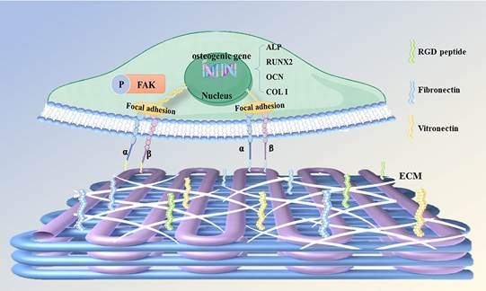 在这项研究工作中,PEKK 与 BG 的共混打印实现了生物活性离子的持续释放,磺化反应显著提升了 PEKK 支架的表面亲水性和粗糙度,同时,填充的晶胶在紫外线照射下与 PEKK 支架共价结合,为后续细胞驻留创造了有效空间。体外实验结果显示,SPBC 对纤连蛋白和玻连蛋白有着较强的吸附能力,能够有效促进间充质干细胞的黏附。进一步研究发现,在 SPBC 支架上培养的细胞内黏着斑激酶在 Y397 位点的磷酸化程度增加,加速了细胞铺展,有利于改善支架的骨整合效果。此外,BG 的添加促进了生物活性离子的持续释放,不仅增强了巨噬细胞的极化和抗炎细胞因子的分泌,还促进了间充质干细胞的成骨分化。动物实验进一步证实,SPBC 具有优异的抗炎性能和与宿主骨组织的整合能力,在骨修复领域展现出重要的应用前景。