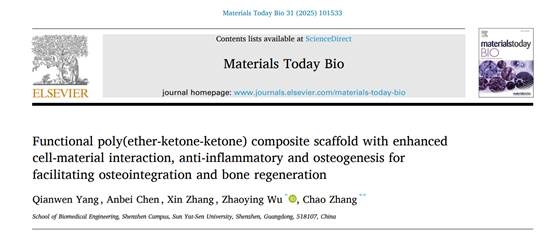 该工作以《Functional poly(ether-ketone-ketone) composite scaffold with enhanced cell-material interaction, anti-inflammatory and osteogenesis for facilitating osteointegration and bone regeneration》为题,发表于中科院一区期刊《Materials Today Bio》。TOMID博士生杨茜雯为第一作者,中山大学张超教授、吴钊英副教授为论文的通讯作者。论文作者还包括中山大学研究生陈安孛、博士生张鑫。304永利集团为论文第一单位。本研究得到了国家重点研发计划、深圳市科技计划、深圳市出站博士后科研资助项目等资助。