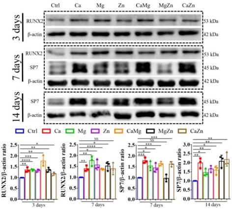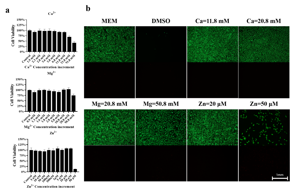 如图2和3所示,确定了不同浓度的单离子和组合双离子的细胞毒性。Ca2+,Mg2+ 和Zn2+单金属离子最大耐受浓度分别为 11.8 mM,20.8 mM 和 20 µM 。由于其他离子的存在可能会影响细胞对单一离子的耐受限度,因此也探究了双离子组合对 BMSC 细胞毒性的影响,结果表明双金属离子组对各金属离子的耐受限度均有所提高。