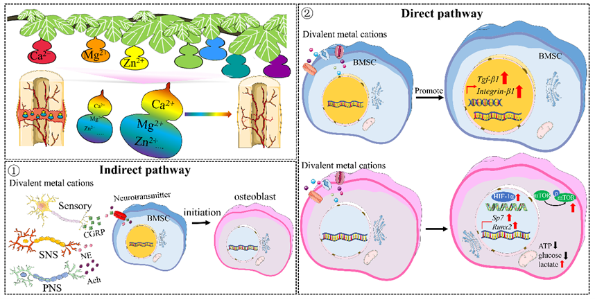 间接途径方面,二价金属离子激活感觉和副交感神经,同时抑制交感神经,继而调控影响骨形成神经递质的释放;直接途径方面,二价金属离子能上调成骨分化启动后成骨细胞活性,并伴随葡糖糖代谢模式从氧化磷酸化转向有氧糖酵解(机制图如图1)。