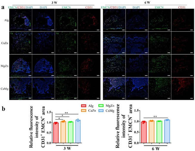 基于CT分析,如骨体积分数(BV/TV)、骨小梁数量(Tb. N)、骨矿物质密度(BMD)、骨小梁厚度(Tb. Th)和骨小梁分离(Tb. Sp)等骨结构参数,表明二价金属离子显著促进大鼠股骨骨缺损区域的新骨形成(图9)。值得注意的是,CaMg离子组合在促进骨再生方面表现出最佳的性能。正如组织学评估所示(图10),二价金属离子显著改善了大鼠骨缺损的愈合质量(包括骨形成、皮质完整性和骨重塑),并伴随骨缺损H 型血管(CD31hi EMCNhi )生成的显著增加(图11)。