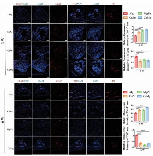 图 13二价金属离子显著上调骨缺损中的 ChAT 阳性区域,并下调TH阳性区域。
