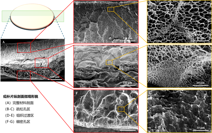 相应地,宋剑/张超课题组着眼于现有疝补片的临床使用痛点,提出了“一种超低溶胀率的梯度结构疝修复补片及其制备方法”,并结合其使用方法申请了发明专利。当前, 疝补片已广泛应用于无张力疝修补术。按照制造方法,可将疝补片分为编织型和非编织型。编织型疝补片具有优异力学性能和生物相容性,但其宏观呈现较大的多孔结构,临床中无法避免缺损处术后粘连、局部感染与非正常愈合等问题。非编织型疝补片是近年的新兴概念,如水凝胶材料、薄膜材料等;在理想状况下,其不仅应该具有超低的溶胀率,以实现无张力修补,而且还应该具有足够的力学性能保障。基于前述梯度结构生物医用水凝胶,课题组将不同液层视为相对独立的功能模块,分别进行功能化后进行分层浇注;通过调整致密层的厚度和时效处理,最大限度地降低材料的溶胀率,最优情况下溶胀率接近0、有助于实现无张力修补;并通过相分离原位生成凝胶体,在层间原位生成过渡区,微观结构互锁、保障补片材料整体的力学可靠性。通过调控PVA‑可溶性小分子填充剂/DMSO‑水溶解系,使得疏松层的孔径保持在数十微米级、同时提升材料的亲水性,促进细胞长入、组织黏附;另一方面,通过塑化剂的加入使得致密层的孔径保持在亚微米级、同时提升材料的疏水性,阻止细胞长入、组织黏附。