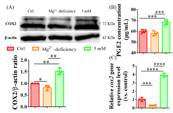 11 不同浓度Mg离子处理48 h后对肌腱源性成纤维细胞COX2/PGE2表达水平影响。