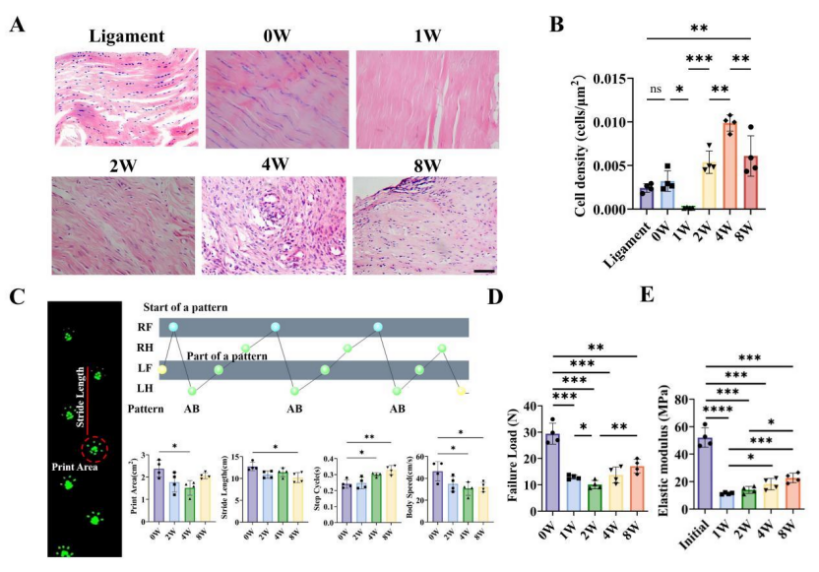 韧带化过程可分为三个主要阶段:炎症期(早期愈合阶段)、增生期和重塑期。各阶段细胞活性存在显著差异。如2所示,术后2周肌腱移植物细胞密度开始增加,4周达到峰值,而8周时出现下降,表明4周是增生期胶原合成的关键时间节点。此外,步态实验和肌腱移植物力学测试表明术后早期愈合阶段肌腱移植物的功能受损。
