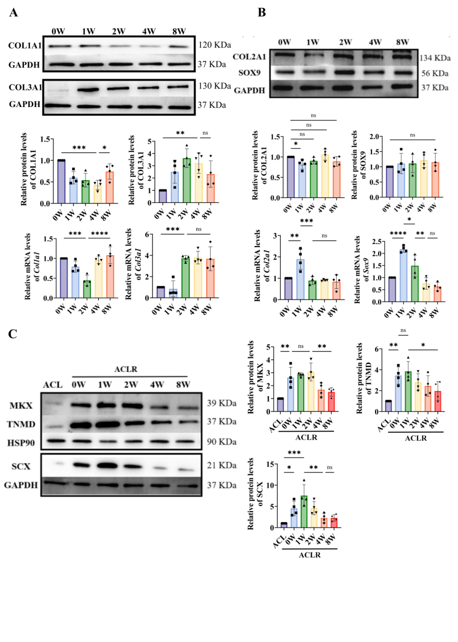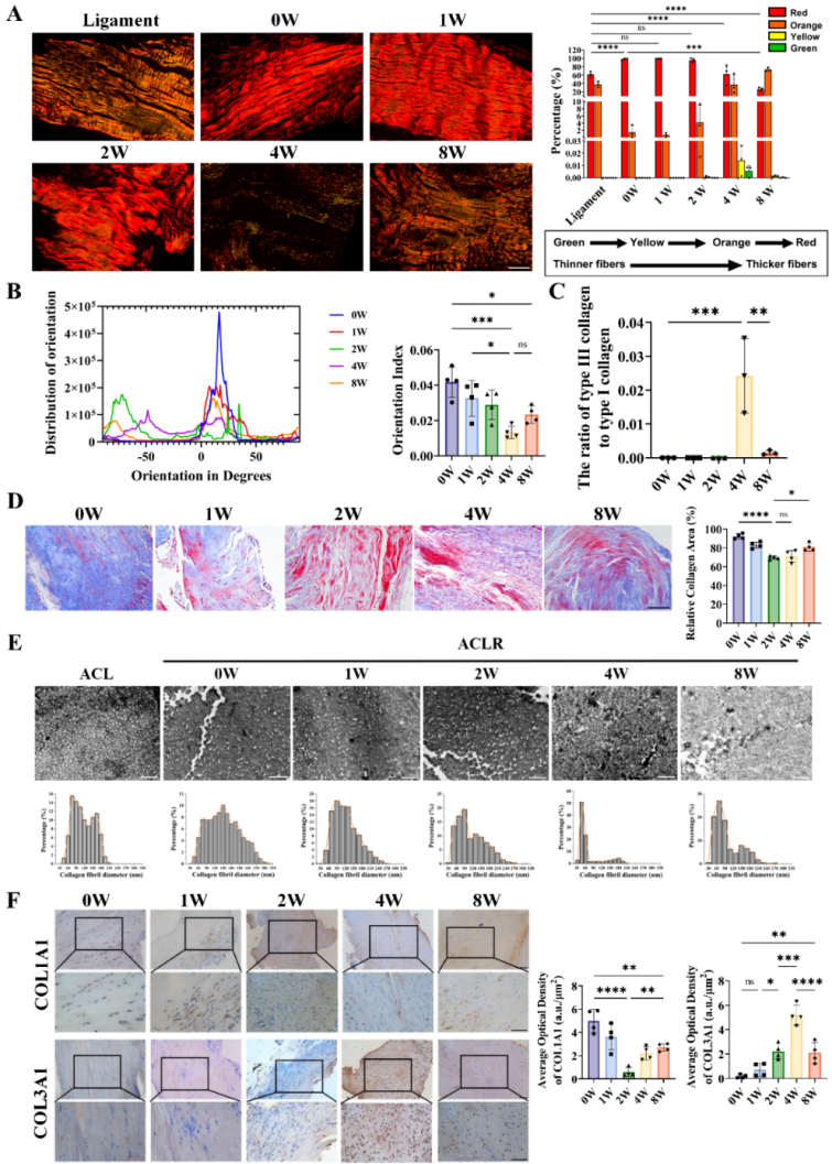 胶原纤维在肌腱移植物中的组织结构密切影响其功能,因此我们对肌腱移植物胶原组成和结构随时间的变化进行表征。如3-4显示术后早期(2 - 4周)肌腱移植物经历胶原重构过程:胶原I α1COL1A1)蛋白水平显著降低,而胶原III α1COL3A1)蛋白水平显著升高,证实了韧带化过程中I型与III型胶原的比例失衡。III型胶原占比升高,导致胶原原纤维直径分布中较细的部分比例增大,加速纤维排列紊乱,共同造成该阶段移植物力学性能显著降低。进一步排除异位骨化的可能性,并通过对肌腱特异性标志物鉴定,表明术后4周可能是肌腱移植物韧带化进程启动的关键节点。