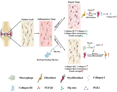 肌腱移植中物质韧带化过程中的纤维化机制及修复策略。在因失神经和失血管而受损的自体肌腱移植物中,坏死的成纤维细胞产生TGF-β1,从而诱导邻近成纤维细胞向肌成纤维细胞转化,产生大量三型胶原,引起肌腱移植物纤维化。镁离子通过促进巨噬细胞分泌PGE2有效减轻肌腱移植中间部分的纤维化,有助于肌成纤维细胞向成纤维细胞的逆转分化。