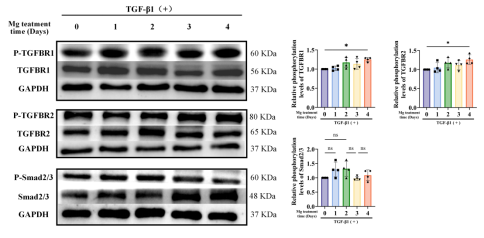 为明确镁离子对PGE2表达的影响,本研究增设镁离子缺乏组,如11所示巨噬细胞释放PGE2具有镁离子浓度依赖性。同时检测了肌腱移植物内巨噬细胞数量的影响,术后1周移植物巨噬细胞数量较术前显著增加(12),但1周后无显著变化,提示促炎/抗炎巨噬细胞在移植物愈合中的关键作用。值得注意的是,镁离子干预对术后4周及8周的巨噬细胞数量均无显著影响。明确镁离子抑制TGF-β1诱导纤维化的基础上,我们检测其对TGF-β1表达的影响,结果(13)显示镁离子的抗纤维化作用不依赖TGF-β1剂量。为探究镁离子对TGF-β1信号通路的调控,实验对TGF-β1预处理的肌腱成纤维细胞添加镁离子。14显示镁离子可能通过不依赖TGF-β/SMAD信号通路的方式间接发挥抗纤维化作用。