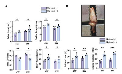 我们制备了一种含镁离子的海藻酸钠水凝胶通过关节腔注射的方式注入大鼠膝关节,以介导肌腱移植物的抗纤维化。如14显示水凝胶在大鼠体内留存7天并释放大多数镁离子。14-15显示镁离子处理组移植物胶原区域显著扩大且III型胶原占比降低,胶原原纤维直径显著上升。分子机制验证表明:含镁水凝胶显著降低α-SMACOL3A1表达,同时提升PGE2水平。针对韧带和肌腱标志基因的实验结果显示镁离子促进了肌腱移植物韧带化水平,但对MKXTNMD等肌腱特异性蛋白表达未显著改变,表明镁离子通过间接调控成纤维细胞逆转分化发挥作用,而不影响干细胞肌腱分化进程。宏观上如16显示经含镁水凝胶治疗后的大鼠膝关节功能水平和肌腱移植物的力学性质较治疗前都有显著改善。