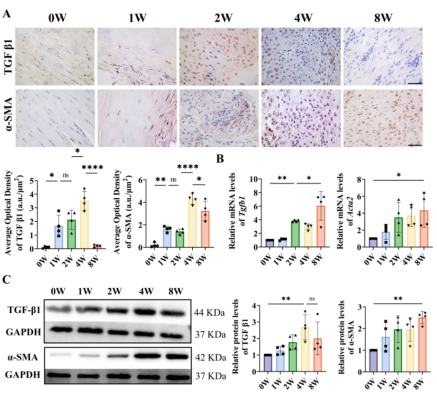 III型胶原是存在于肌腱瘢痕组织中的一种蛋白,而TGF-β1是影响肌腱愈合、瘢痕形成和胶原生成的细胞因子。如5所示TGF-β1α-平滑肌肌动蛋白(α-SMA)在愈合期显著升高,表明TGF-β1可能是促移植物瘢痕组织合成III型胶原的关键诱因。