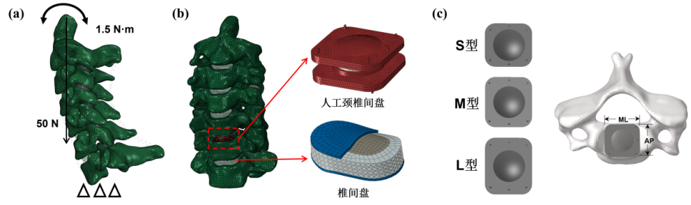 研究团队设计并生成了一系列具有不同终板尺寸的球窝结构人工颈椎间盘,通过比较术后颈椎活动度、小关节面应力以及植入界面的平均应力,为后续的人工颈椎间盘设计提供依据。研究发现,L型假体在植入界面处的平均应力最低,M、L型假体在植入上界面处的应力差异不显著。足印面足够大的假体可有效分散界面应力,减小术后界面微动和假体术后塌陷概率。