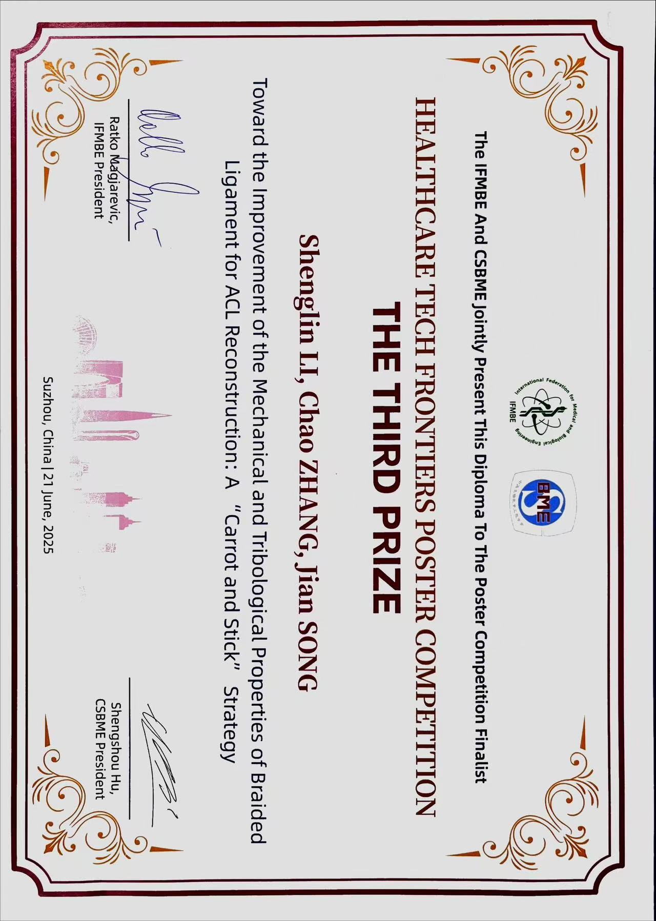 2025中国生物医学工程大会暨创新医疗峰会(2025BME)于2025年6月20-23日在苏州举行,TOMID 22级博士生李昇霖(导师:张超/宋剑)参加“Frontier in Development of Healthcare Technologies”分论坛,并在“医疗科技前沿创新壁报赛”中荣获三等奖。