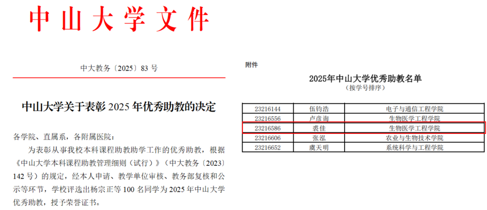 TOMID研究生裘佳获评2025年中山大学优秀助教