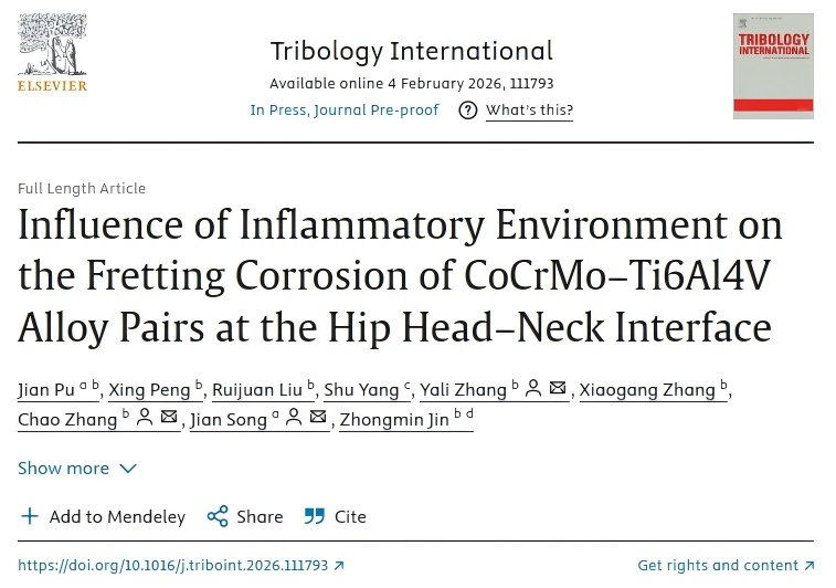 论文链接:Jian Pu, Xing Peng, Ruijuan Liu, Shu Yang, Yali Zhang, Xiaogang Zhang, Chao Zhang, Jian Song, Zhongmin Jin. Influence of Inflammatory Environment on the Fretting Corrosion of CoCrMo–Ti6Al4V Alloy Pairs at the Hip Head–Neck Interface, Tribology International, 2026, online, https://doi.org/10.1016/j.triboint.2026.111793.